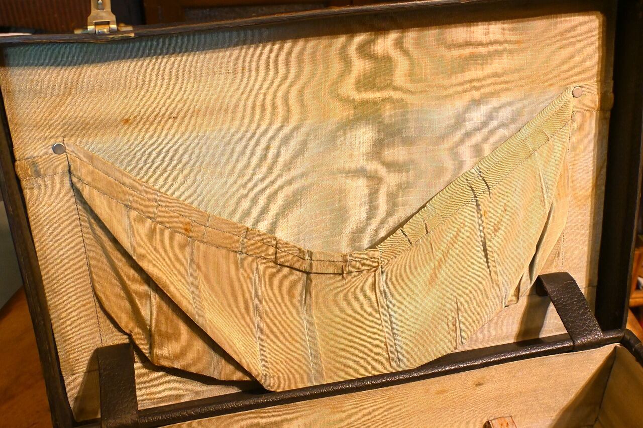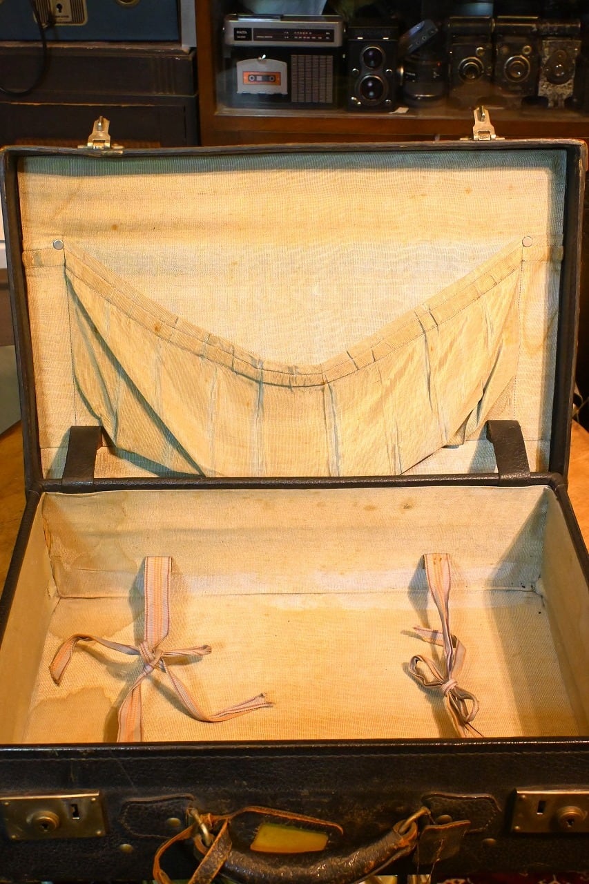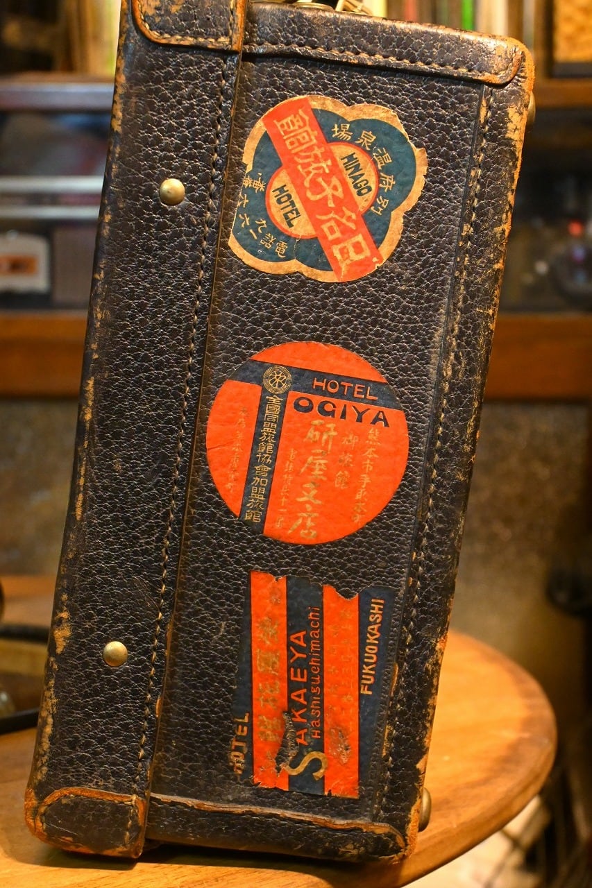 側面に九州地方の宿のシールが貼ってあります。中には有名な日名子旅館の物もあり、1951年には日名子ホテルへ商号が変更される以前ですのでトランクの年代も相応です。